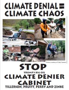 January 9, 2017 Over 125 people Join Rally in Denver as Part of National Protests Against Trump’s ‘Climate Denial Cabinet’ FOR IMMEDIATE RELEASE ***Click photo for video from event *** January 9, 2017 CONTACT: Micah Parkin, 350 Colorado,...