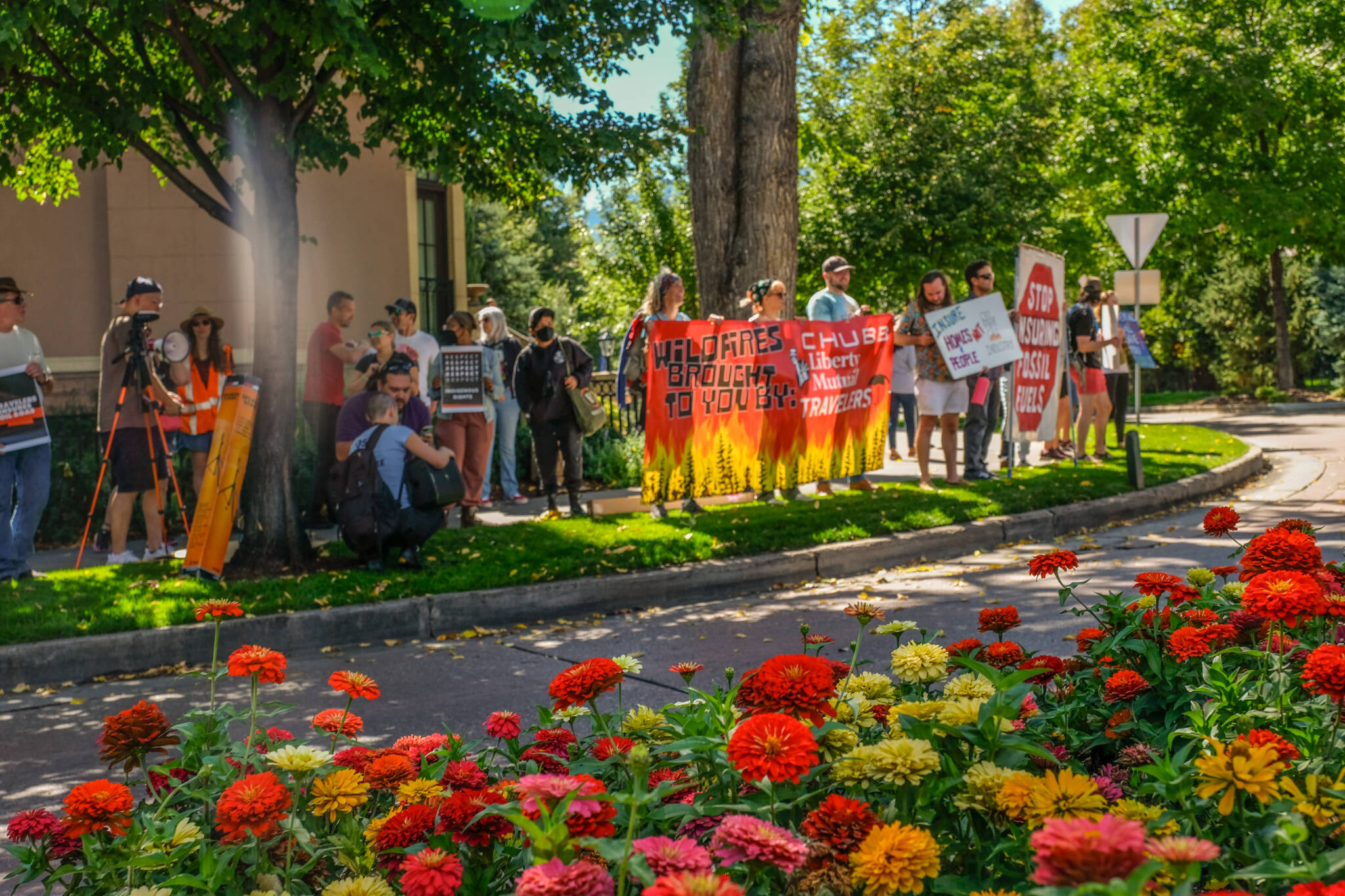 Colorado Spring, CO – Coloradans wielding signs that say ‘‘Wildfires brought to you by Liberty Mutual, Travelers, and Chubb” and “Code Red Climate Emergency” protested an elite gathering of insurers at the Broadmoor hotel.